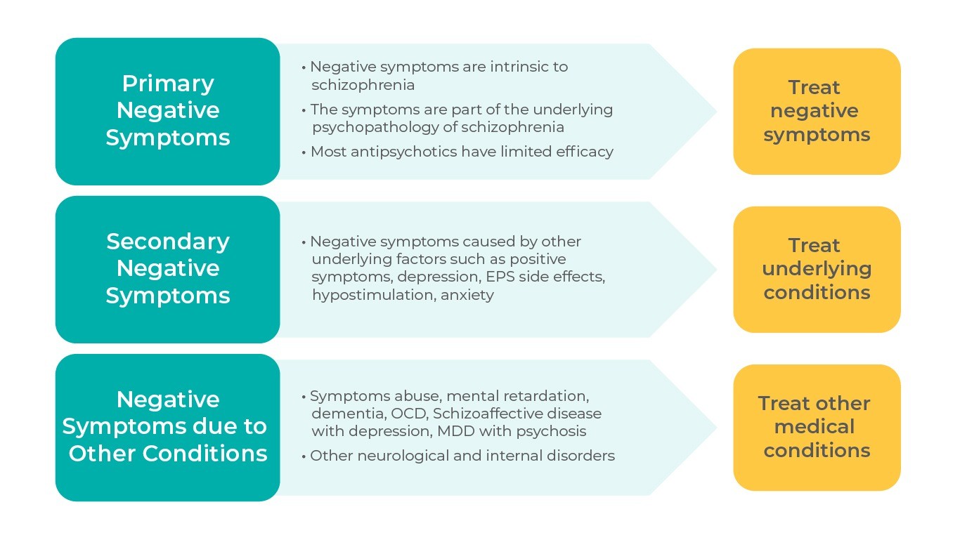 Primary and secondary negative symptoms may be the most important distinction in the negative symptom lexicon because of their different clinical implications. Primary negative symptoms are intrinsic to the underlying pathophysiology of schizophrenia and treatment options are limited. Secondary negative symptoms occur secondarily to, or are caused by, positive symptoms, affective symptoms, medication side effects, environmental deprivation, or other treatment- and illness-related factors2. For example, negative symptoms could be a secondary effect in a patient who becomes socially withdrawn after experiencing delusions of persecution or paranoia, or depression could present with substantial anhedonia, an absence of initiative, social isolation, and motor retardation. If possible, it is important to differentiate primary and secondary negative symptoms because secondary symptoms can respond to treatment of the underlying cause, while primary negative symptoms are generally not responsive to most commonly used antipsychotics.